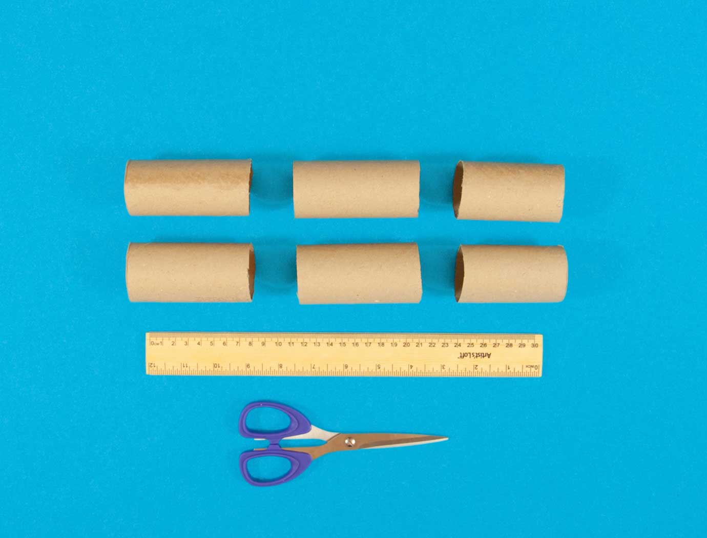 To make the legs, first measure and cut the kitchen roll tubes into 9cm pieces, remembering to save one of the leftover pieces for the ears.
